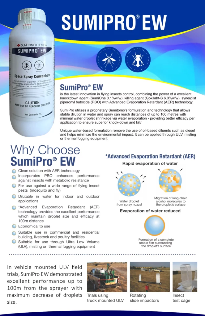 Sumipro EW là chế phẩm diệt muỗi và côn trùng thế hệ mới từ Sumitomo Chemical – Nhật Bản, được đánh giá cao về tính an toàn, khả năng khuếch tán không gian, hạ gục nhanh và hiệu lực kéo dài.