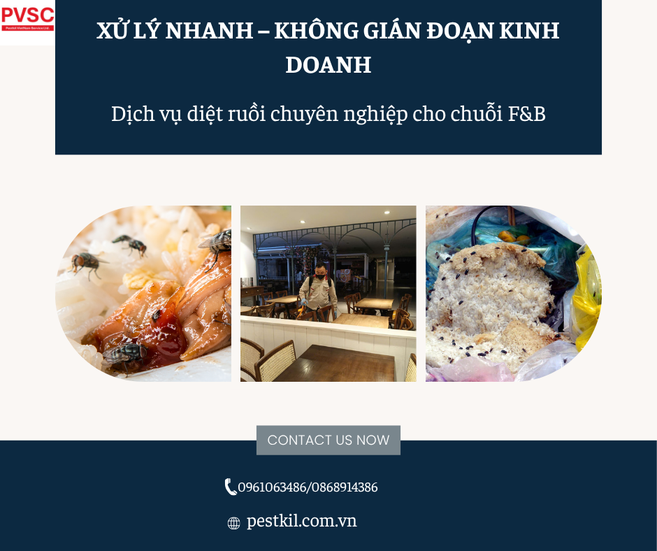 Pestkil Vietnam ( PVSC ) ,cung cấp dịch vụ diệt ruồi nhà hàng, bếp công nghiệp tại Hưng Yên, Hà Nội, Bắc Ninh. Giải pháp an toàn thực phẩm, chuẩn HACCP, hiệu quả lâu dài.